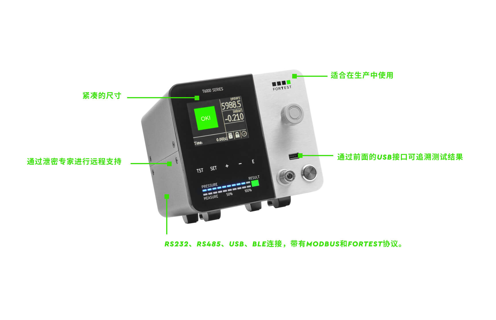 测试结果的可追溯性是生产线末端质量控制的终点。ForTest已经创建了软件,将设备的操作与客户可用的信息技术仪器进行整合,从保存测试结果数据到测试图表的趋势。通过Leak Expert App直接在控制单元上进行远程支持的能力,也促进了技术支持活动。